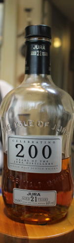 | ▲(左)今月の一杯目はエドラダワー13年(1998)イビスコ・デキャンタ。(右)アイル・オブ・ジュラ バイセンテナリー 200周年記念ボトル。ジュラ島唯一の蒸溜所のジュラ蒸溜所200周年記念のボトル。 |